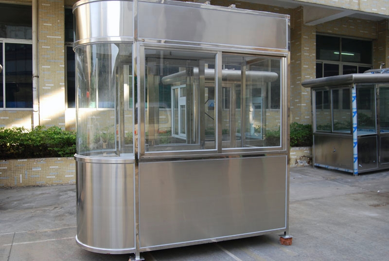 YT-B25精挑細選采用優質304不銹鋼鏡面拉絲量身訂做、在不銹鋼崗亭兩端采用熱彎鋼化玻璃結合橢圓弧的設計、使在崗亭內值班的人員視野開拓、