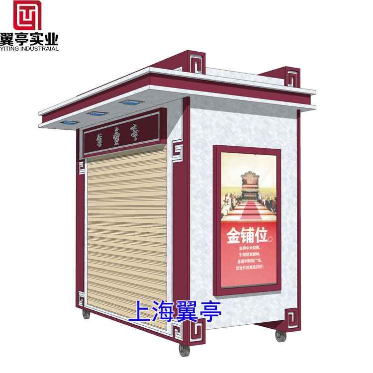 精致小巧的書報亭整個外部形象采用白色和磚紅色紅色的靚麗和白色的整潔、給人一種視覺上的享受、這樣的書報亭不管放在哪里都是一道靚麗的風景線、底部帶有滑輪方便隨身移動、敞開式的卷簾門設計、不但方便顧客來選購書籍報刊雜志、更能清楚展示書報亭內的商品、書報亭頂部裝有方型水晶的燈飾讓書報亭更加的美觀。