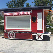 1這款售貨亭的尺寸要偏長,長度在5-6米才好看。因為它的前面一部分是模仿古時候的蒸汽火車頭有一米左右為裝飾。