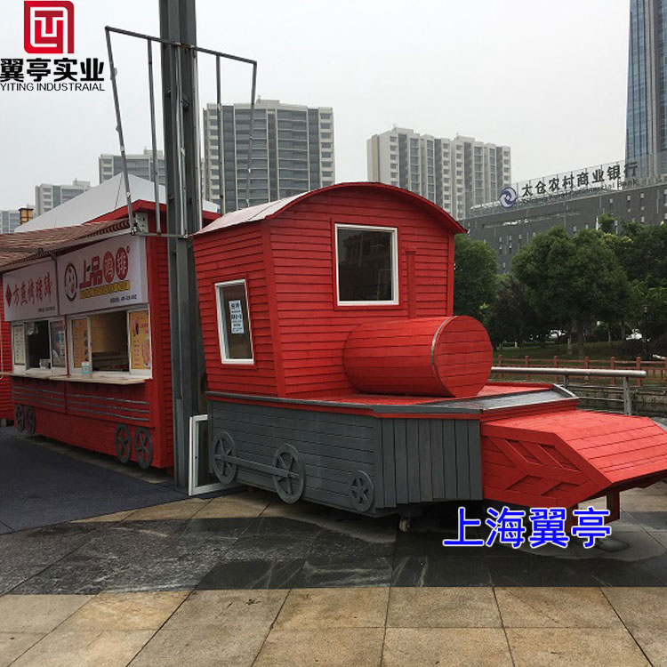主要特點 1.這款售貨亭的尺寸要偏長,長度在5-6米才好看。因為它的前面一部分是模仿古時候的蒸汽火車頭有一米左右為裝飾。