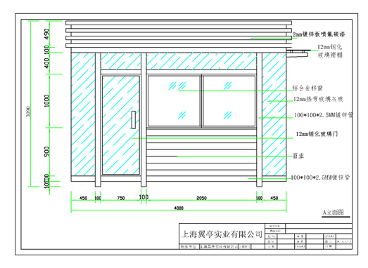 首先進入我們眼簾的就是崗亭的長和高,崗亭的長是4米,高是3米,其次是門窗的位置以及門窗的尺寸,然后墻體上還有很多是綠色的線條,大家可能看不明白綠色的線條是什么意思?這個時候我們眼睛就要移動到圖紙的右邊,右邊就有對每一個地方材質解釋的說明,像這樣綠色線條的代表的就是它的墻體是玻璃的,當然部位不同玻璃也不一樣,像450mm的轉角處采用的是就是12mm熱彎玻璃,而平面的墻體采用的就是12mm鋼化玻璃,大家還要注意的地方就是熱彎玻璃是不能鋼化的,這也是為什么同樣的玻璃還要單獨標明的用意。在上海翼亭崗亭廠家定制的崗亭一定是讓你清楚明了每一個步驟和崗亭的每一處的用料。